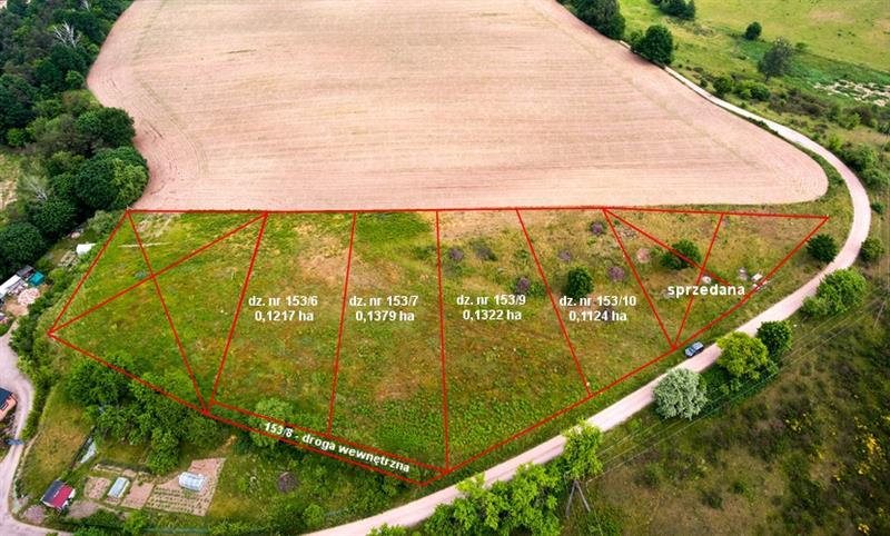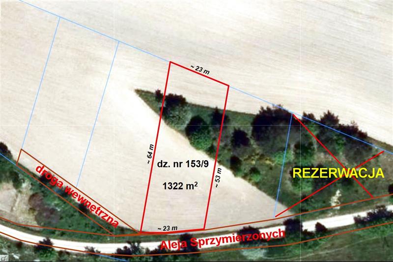Oferowana działka nr 153/9 ma powierzchnię 1322 m2 i kształt zbliżony do prostokąta o szerokości ok. 23 m i długości ok. 53 - 64 m. Powierzchnia działki płaska, lekko nachylona w kierunku południowym. Granice działki oznaczone geodezyjnie. Jest to jedna z sześciu nowo wydzielonych działek.