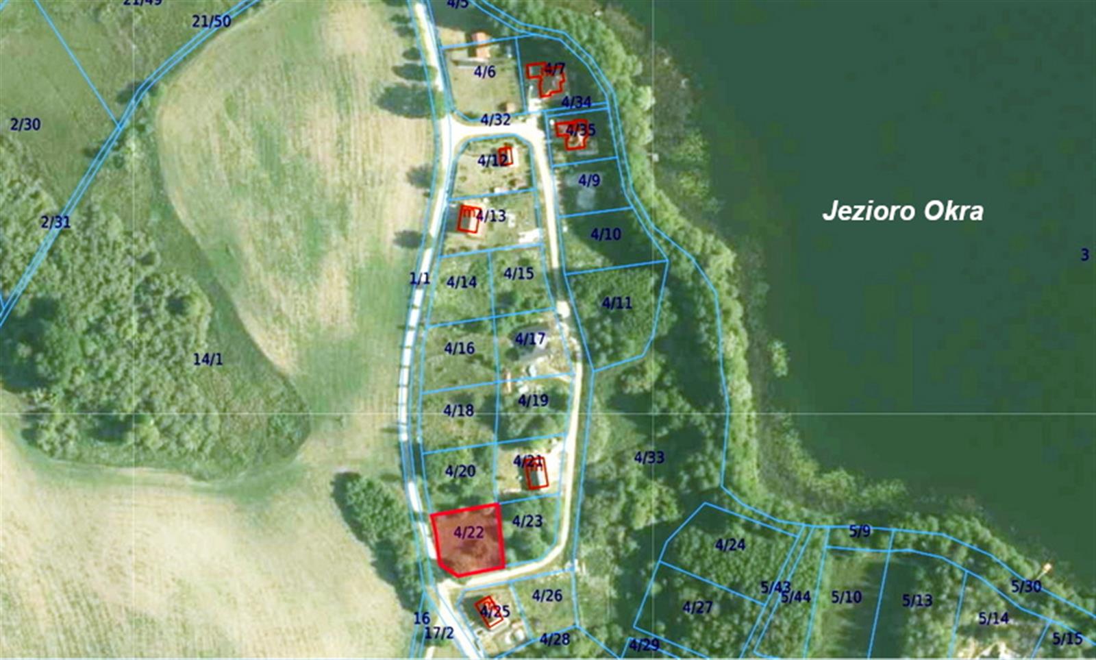 Mająca kształt zbliżony do czworokąta o bokach ok. 32 m - 35 m działka nr 4/22 ma powierzchnię 1075 m2. Powierzchnia lekko nachylona w kierunku jeziora. Jednym bokiem (front działki) działka przylega do ul. Stefana Okrzei a drugim do ul. Liliowej.