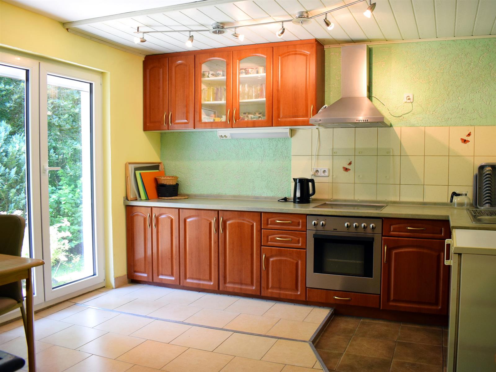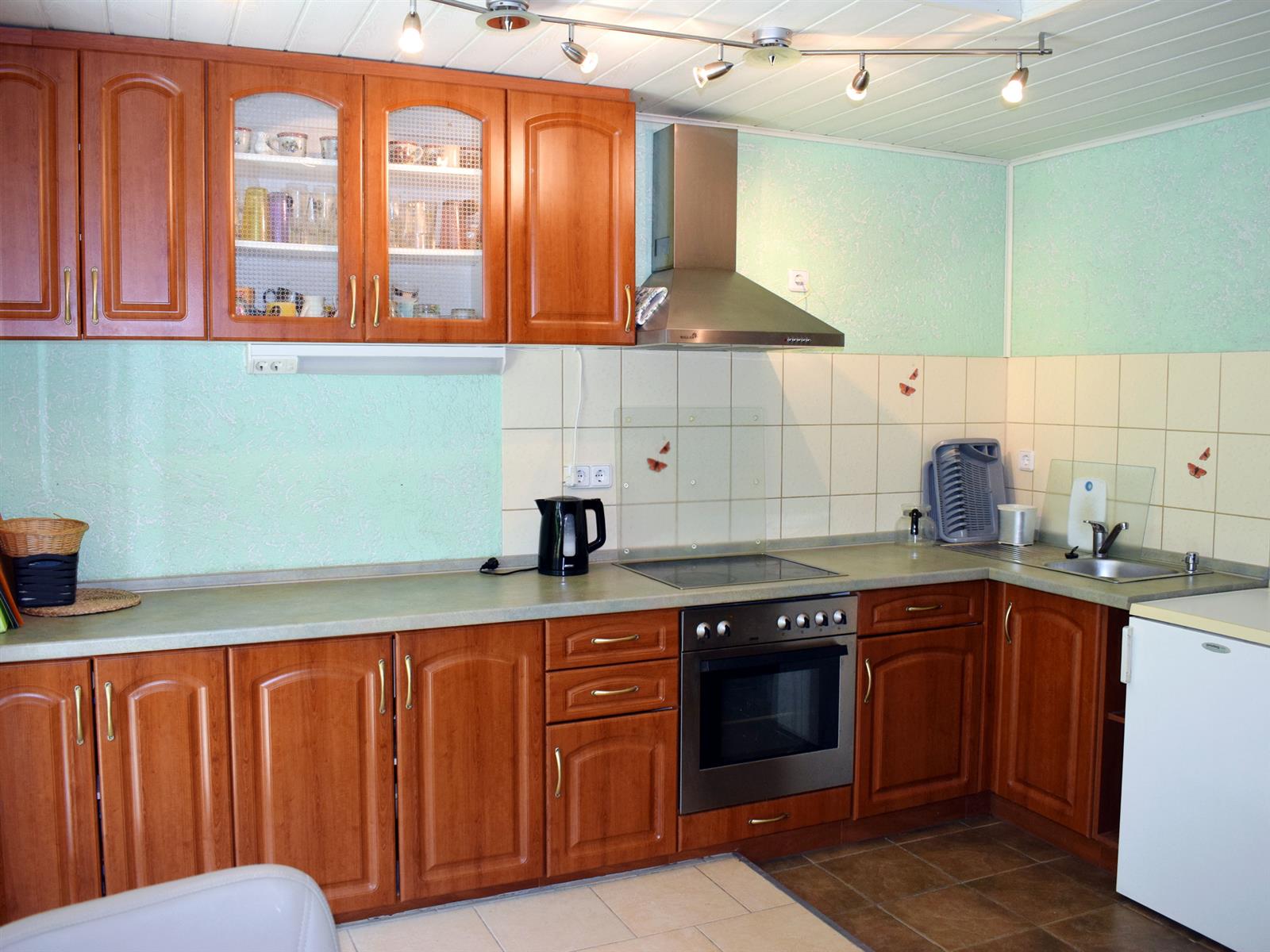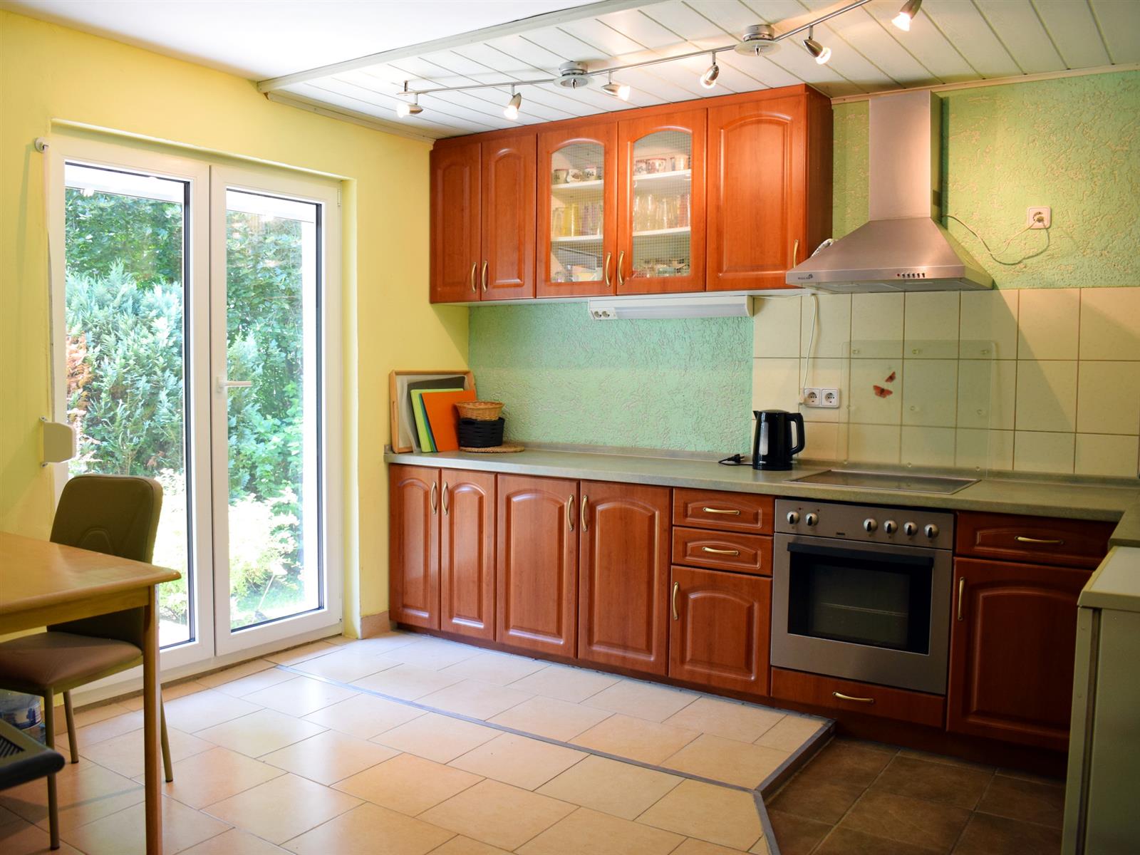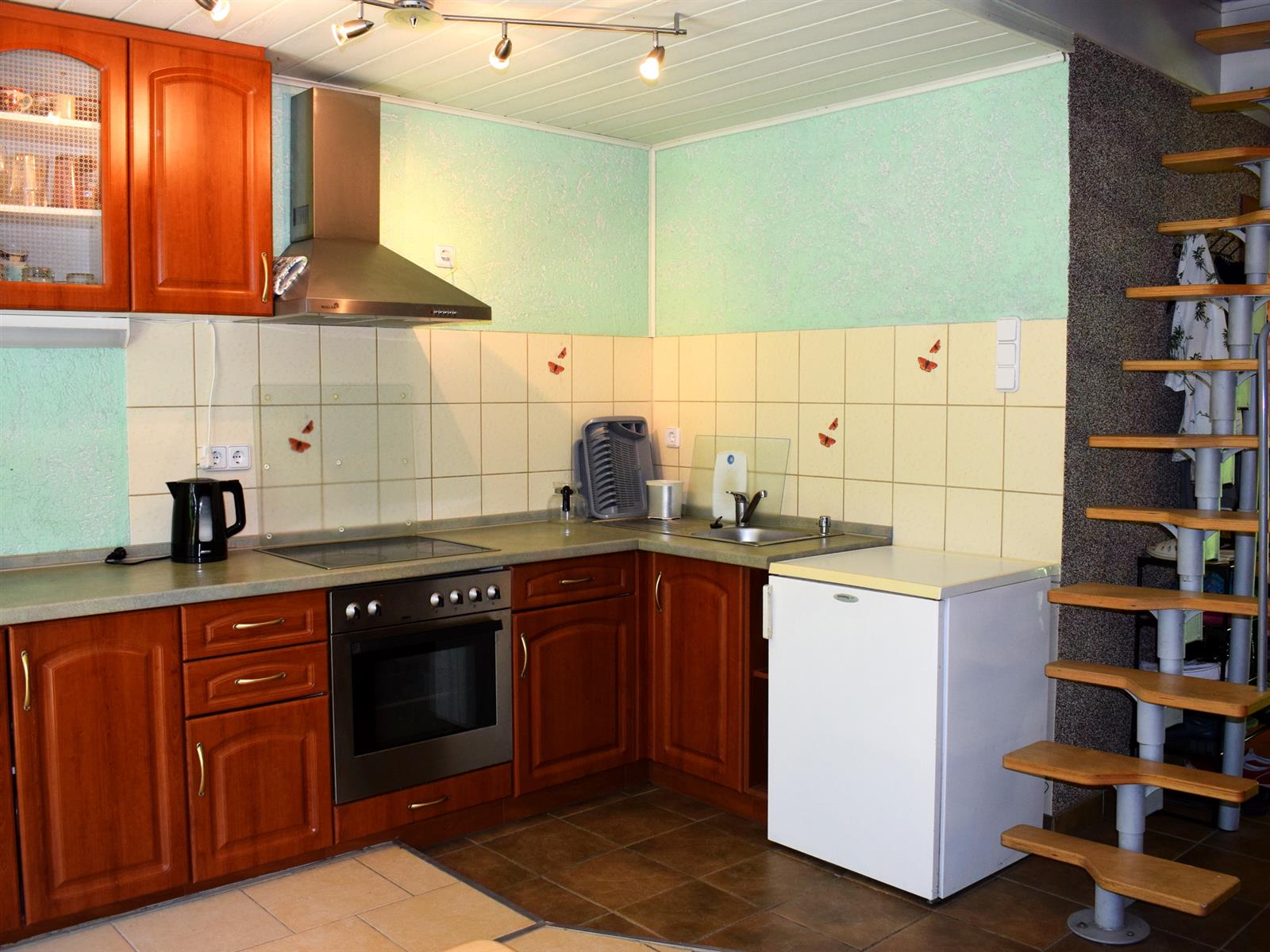 W aneksie kuchennym meble w zabudowie z urządzeniami AGD (elektr. płyta kuchenna z piekarnikiem, okap kuchenny, zlewozmywak wpuszczany w blat).