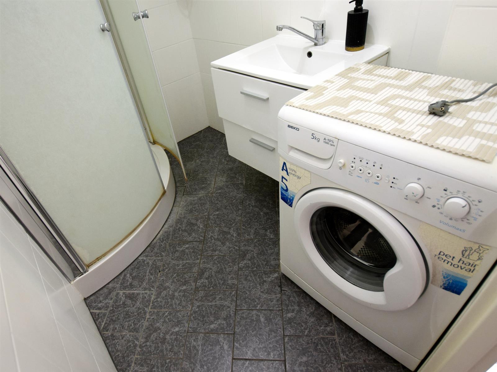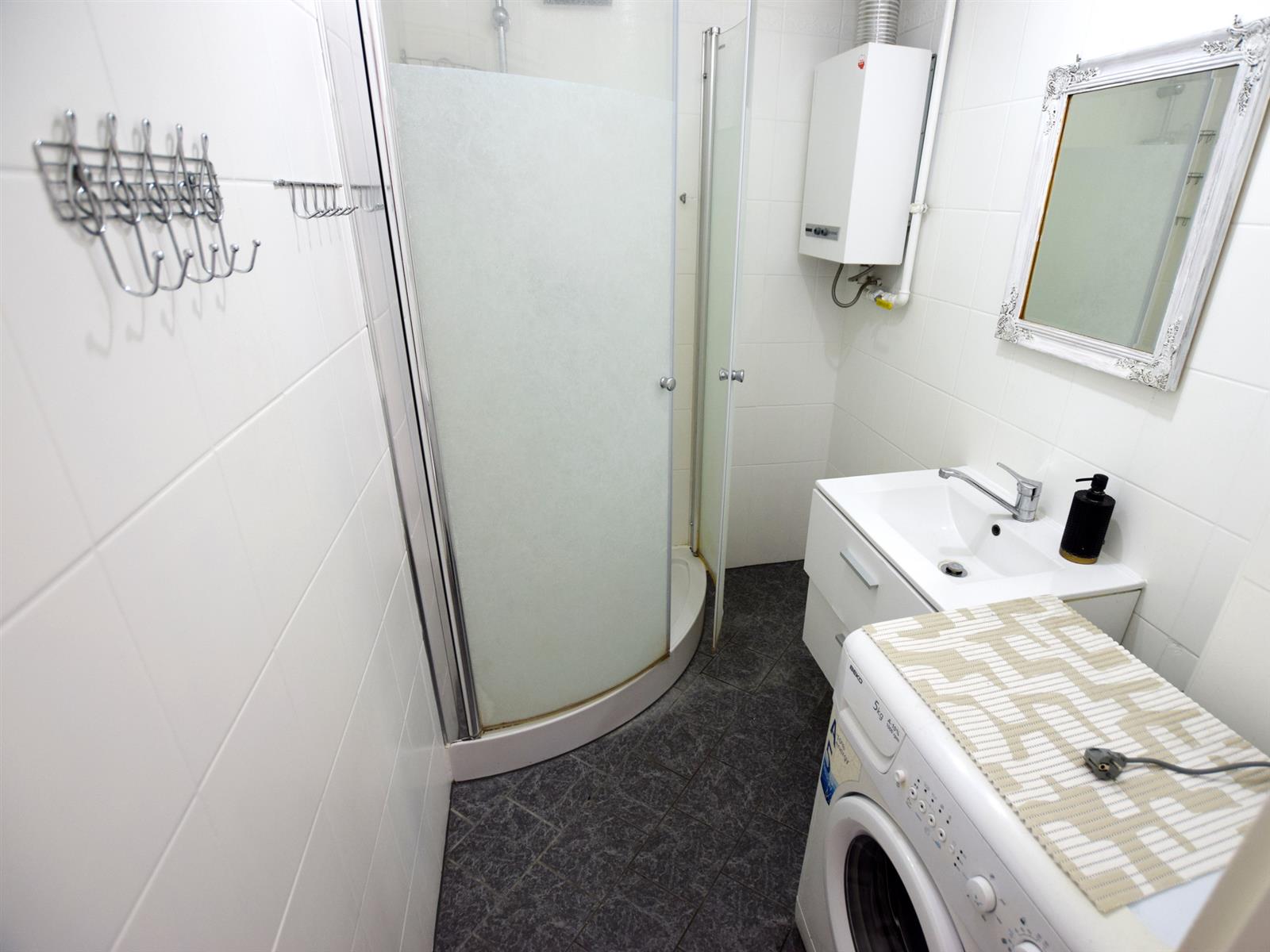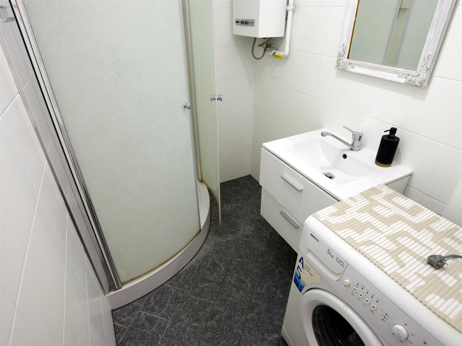 W łazience: glazura i terakota, kabina prysznicowa, umywalka z szafką, pralka, lustro, gazowy podgrzewacz wody. W osobnym WC podwieszana miska ze spłuczką podtynkową.