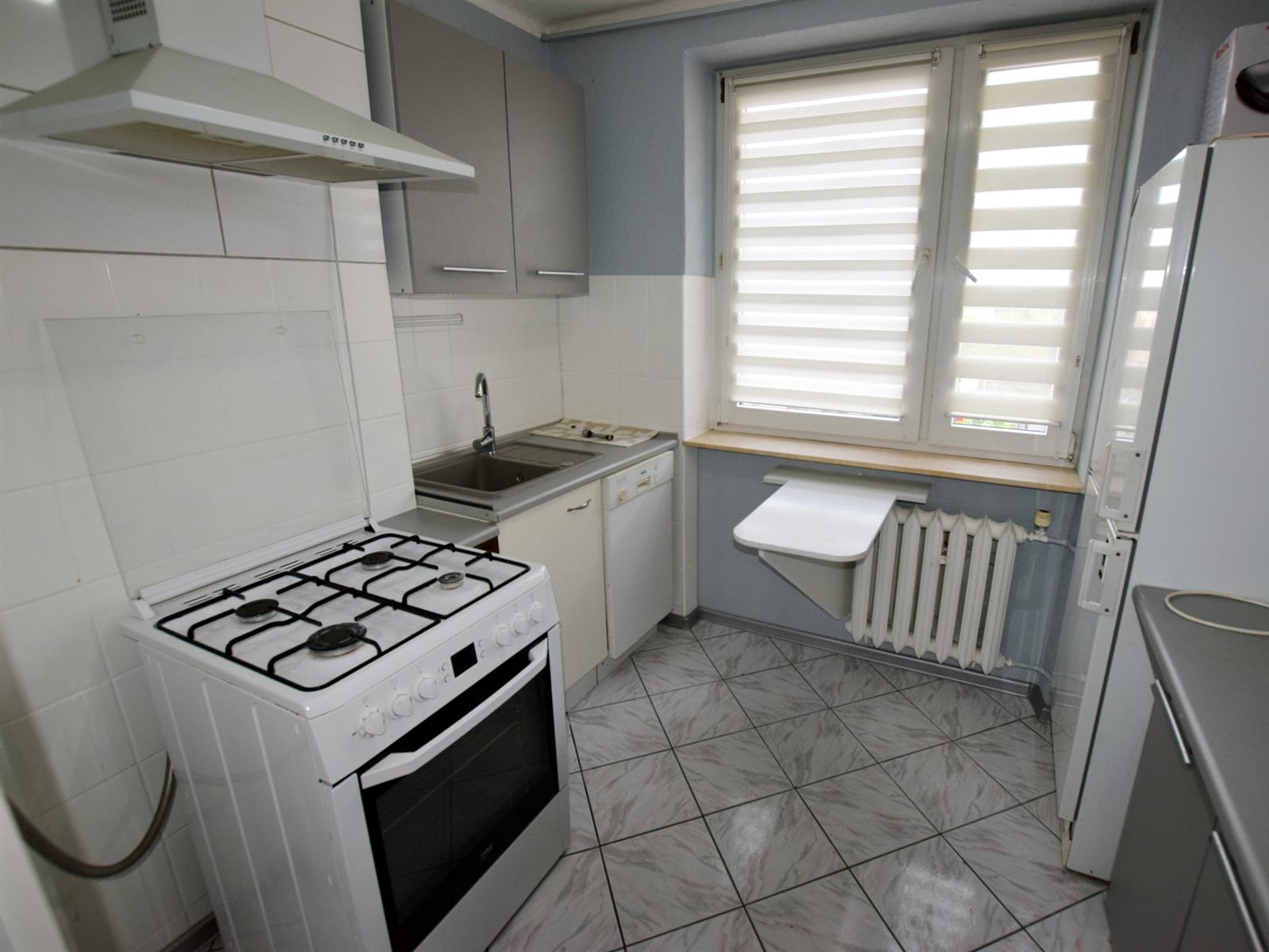 Kuchnia wyposażona w meble w zabudowie, urządzenia AGD (kuchenka gazowa z piekarnikiem, okap kuchenny, zlewozmywak wpuszczany w blat, zmywarka, lodówka).