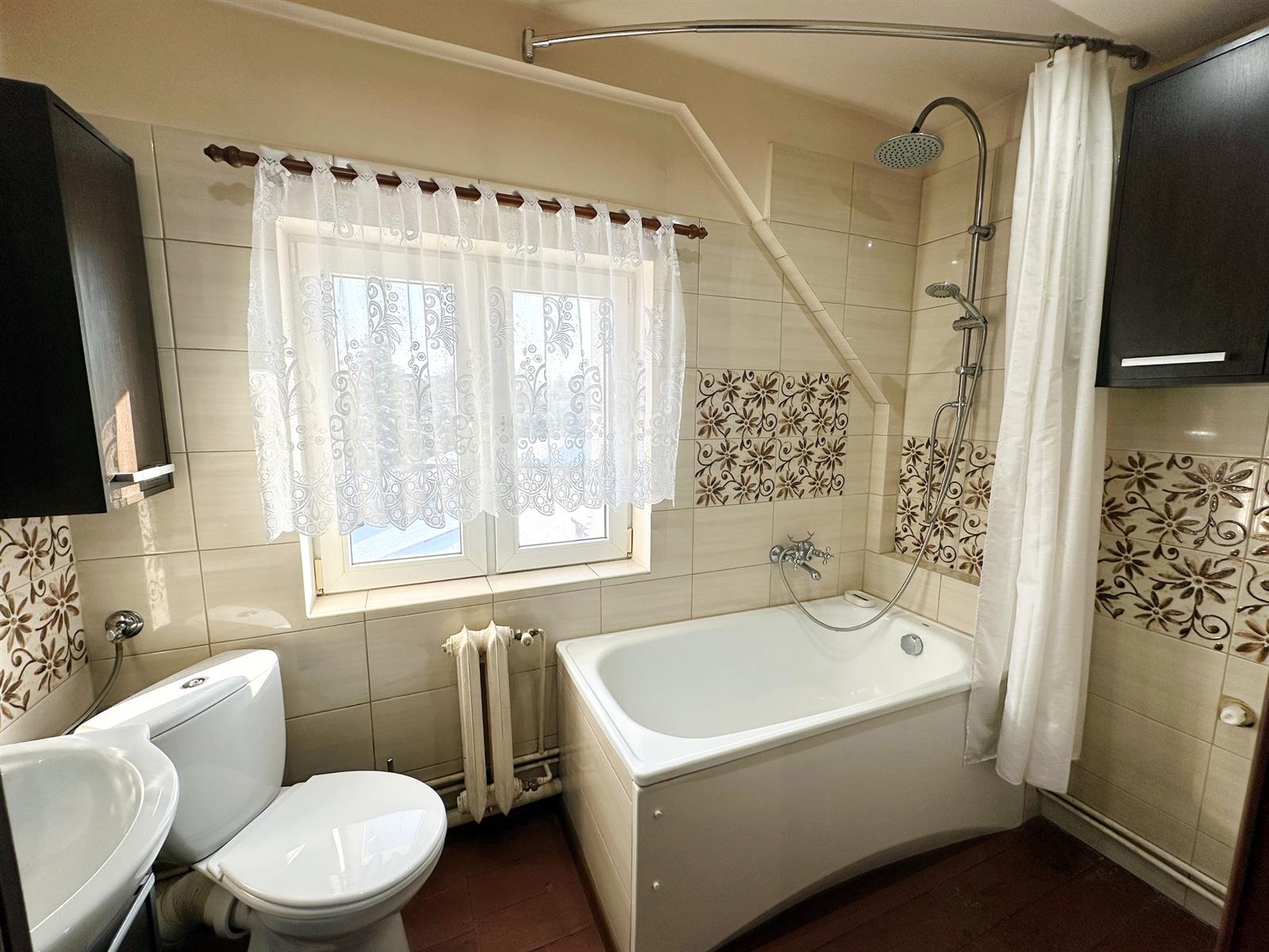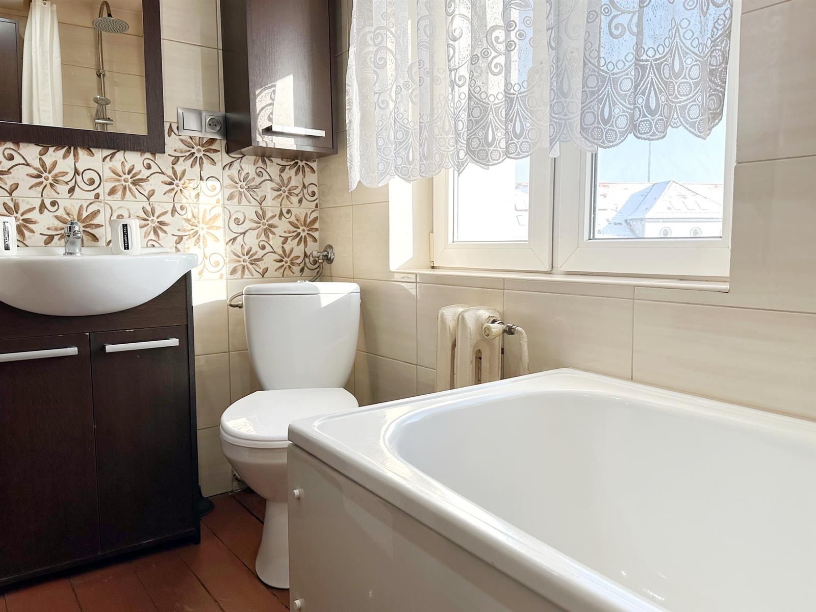- łazienka: glazura, wanna z prysznicem, umywalka, WC, okno